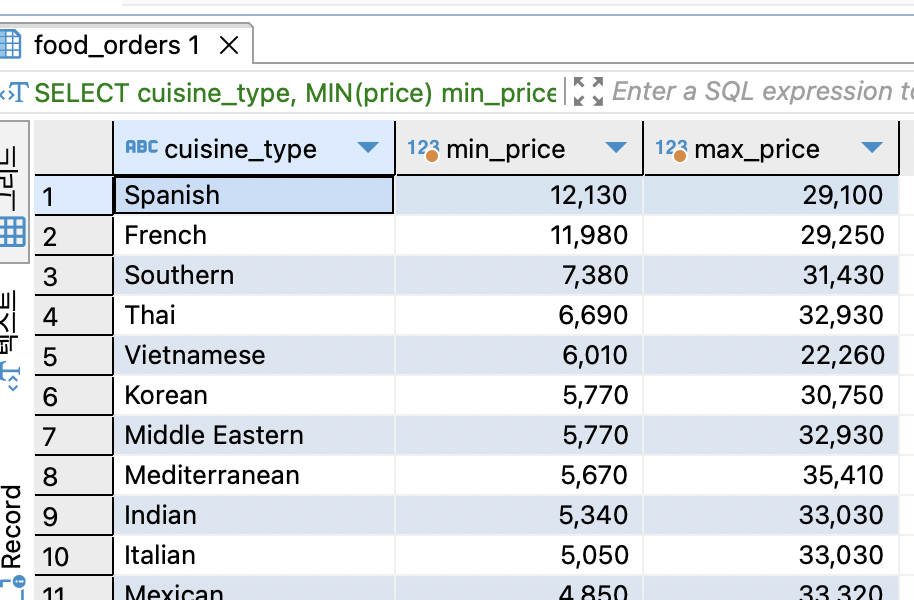 SELECT cuisine_type, MIN(price) min_price, max(price) max_price